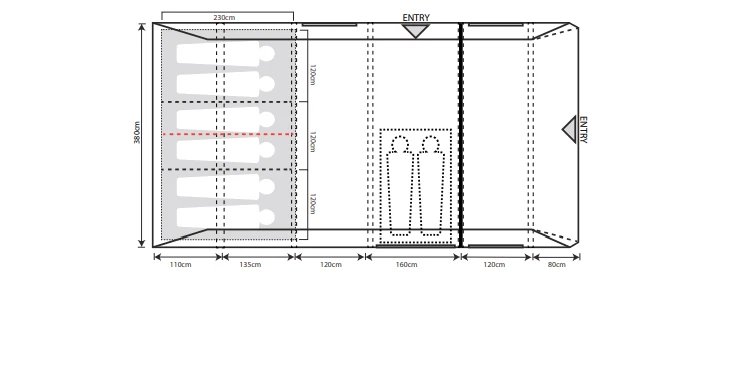 | Features | Intelligent Frame Relief System – allows air out if the beams expand too much Vortex Ventilation System reduces condensation. Sewn-in groundsheet is main living space 6 Person design – with zipped dividers Polyester Zip-up curtains offer added privacy of an evening – included on canopy curtains. Storm Strap Attachment points Includes Two Storm Straps. New darker deep sleep inner reduce early morning light |