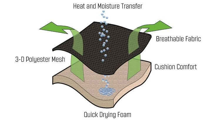 - Fabric: Textiline, 3D mesh with quick-dry foam, 100% polyester